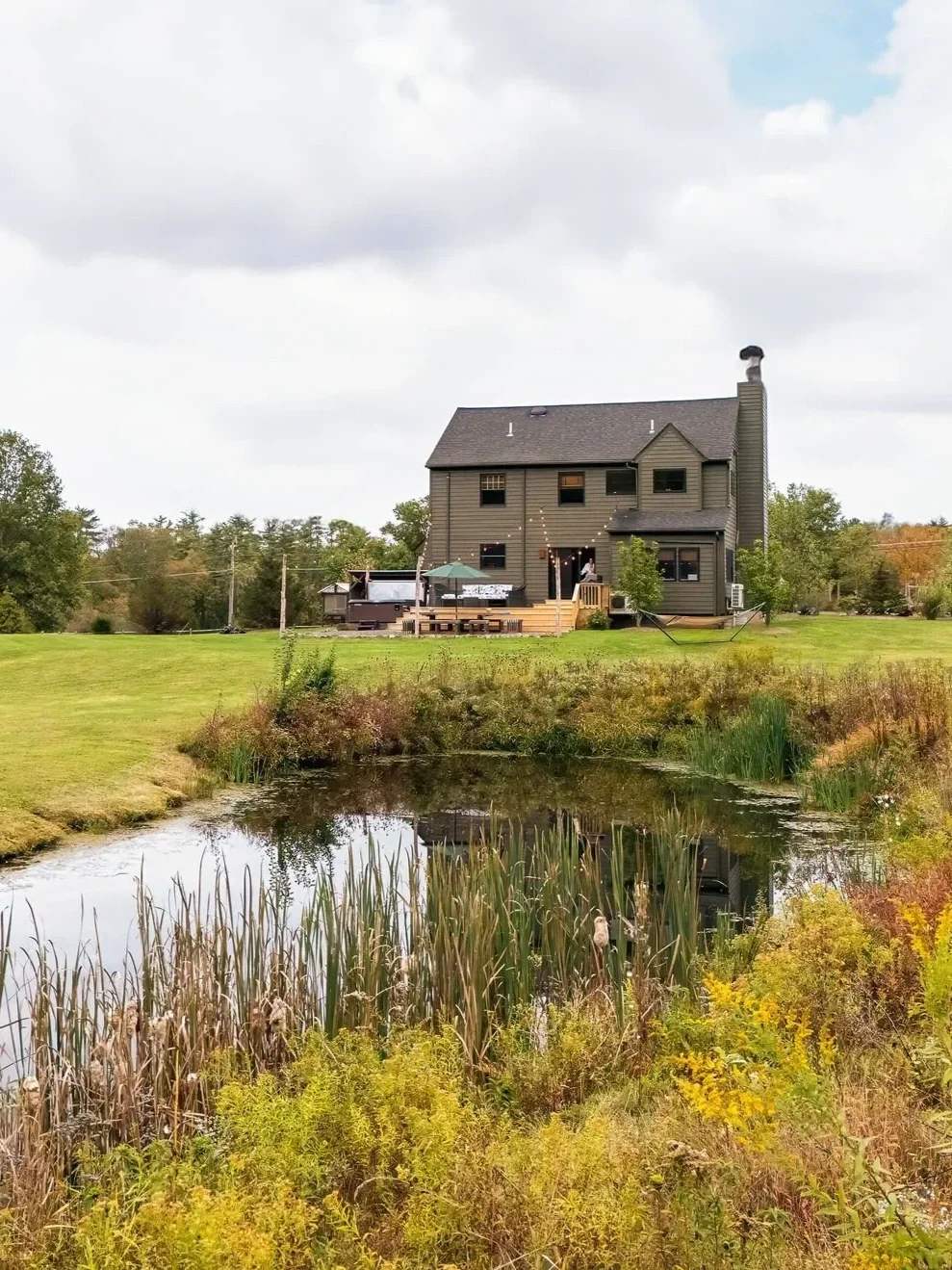 You are staying at the Farmhouse — perched on seven private acres overlooking the farm. With 4 bedrooms, 2.5 bathrooms, a stocked pond, hot tub, and plenty of indoor and outdoor gathering spaces, it’s a true countryside retreat.