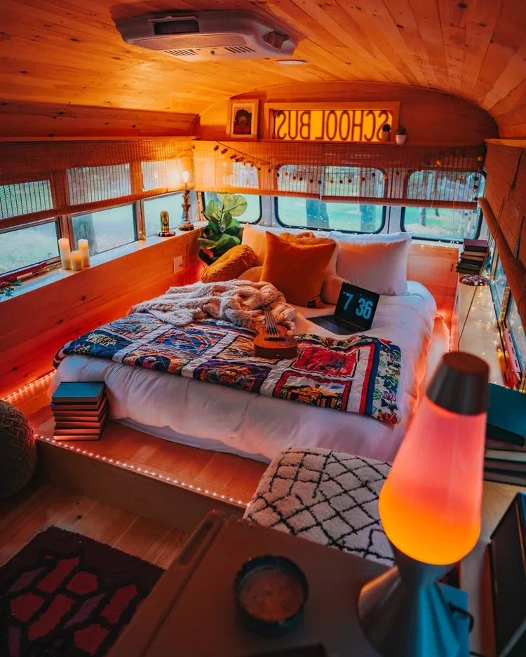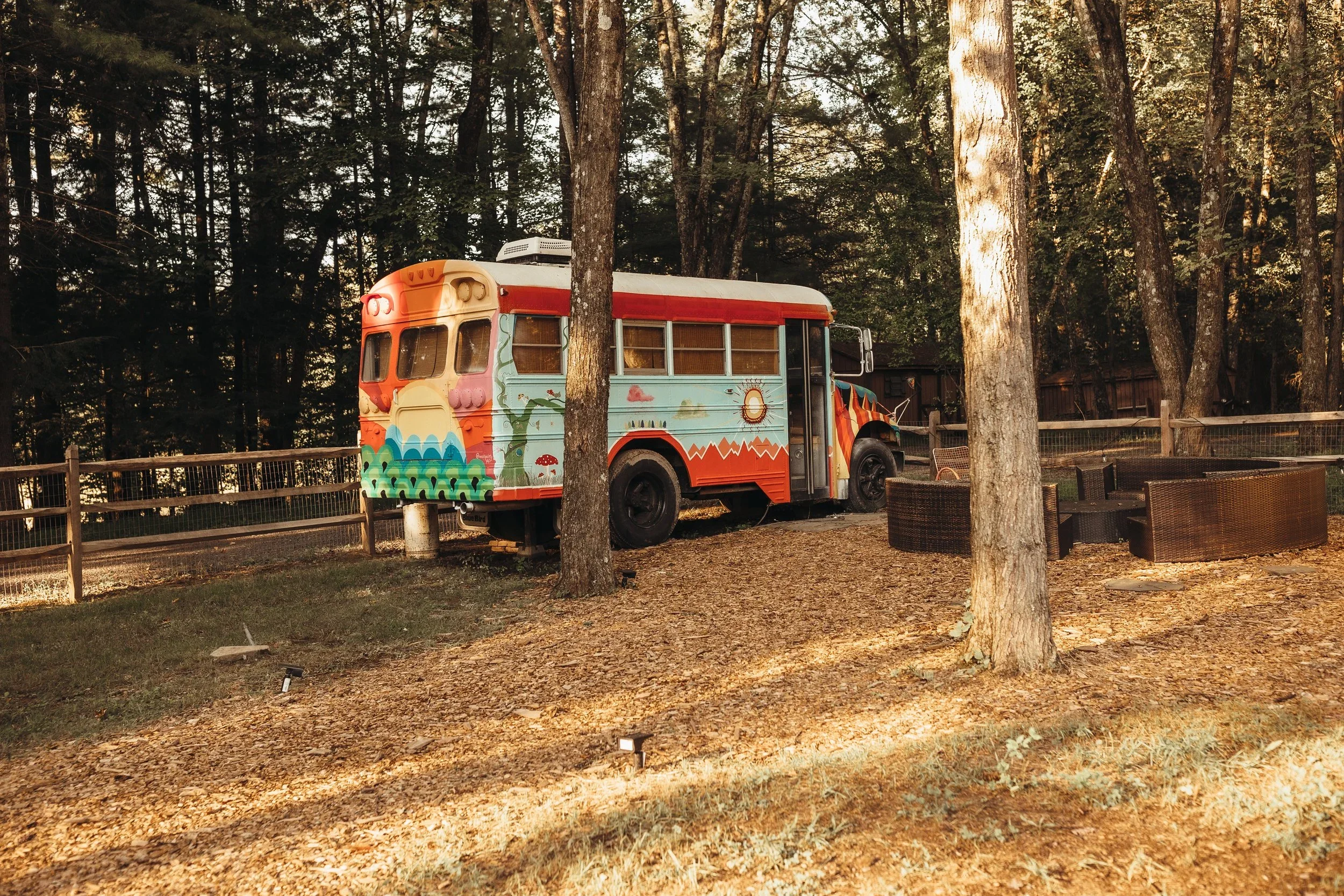 You are staying in the Bus — our playful nod to the “Further Bus.” This converted school bus (1 bed, sleeps 2) has full electricity, AC/heat, and plenty of charm. You’ll find it tucked in the gardens by the pool area.